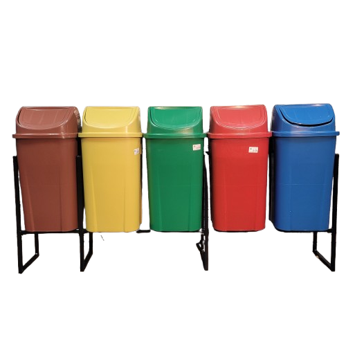 Conjunto com 5 lixeiras de coleta seletiva, para descarte de resíduos sólidos, ideal para uso em condomínios residenciais ou ambientes comerciais e industriais.
