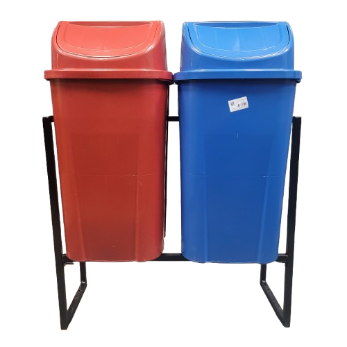 Conjunto com 2 lixeiras de coleta seletiva, para descarte de resíduos sólidos, ideal para uso em condomínios residenciais ou ambientes comerciais e industriais.