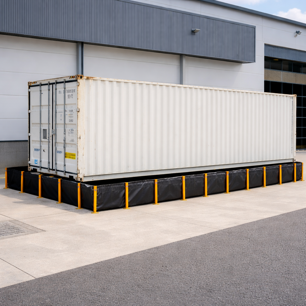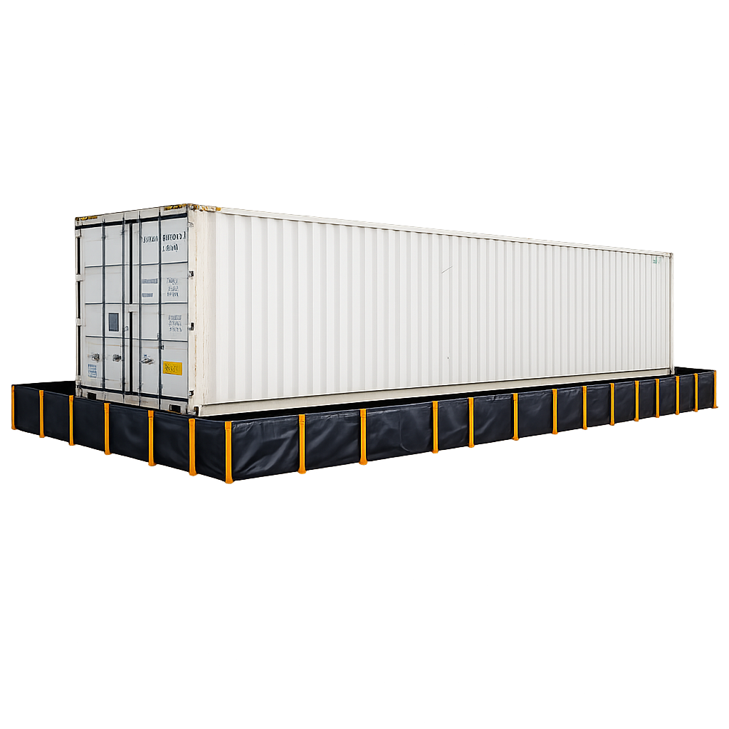Projetadas para reter vazamentos de combustíveis, óleos e produtos químicos, protegem o solo e asseguram conformidade ambiental. São instaladas do lado externo do container, para operações que envolvam o transbordo de insumos ou armazenamento temporário com líquidos perigosos.
