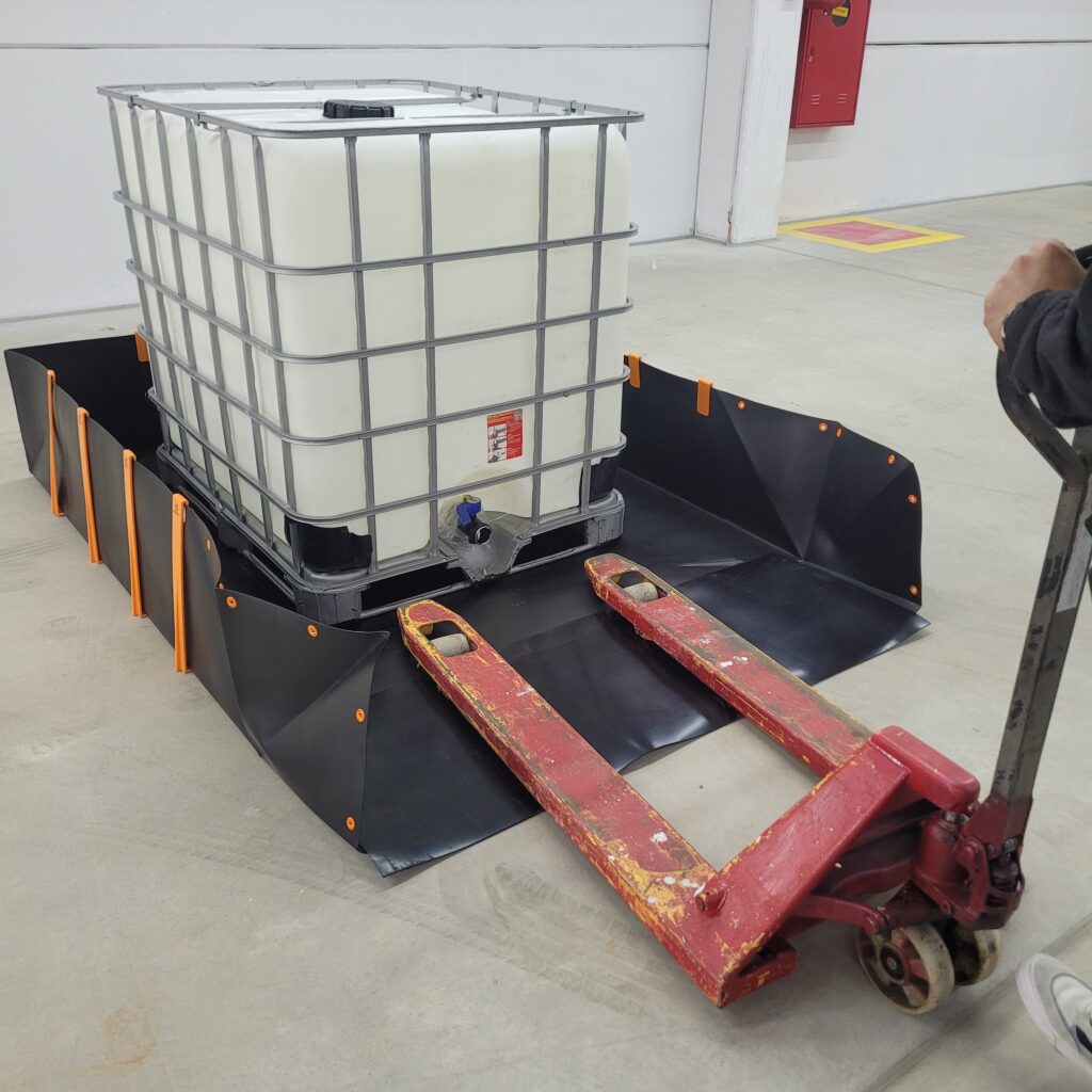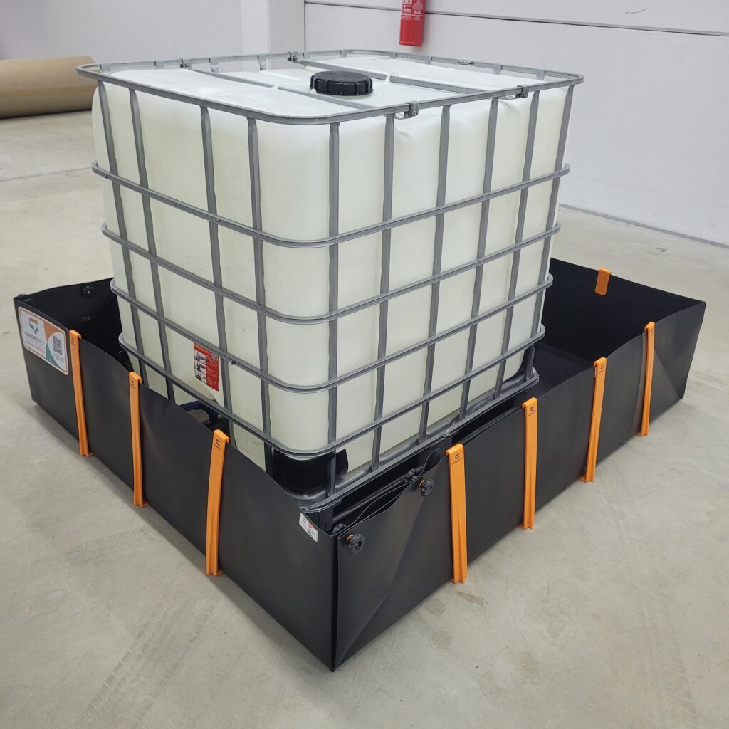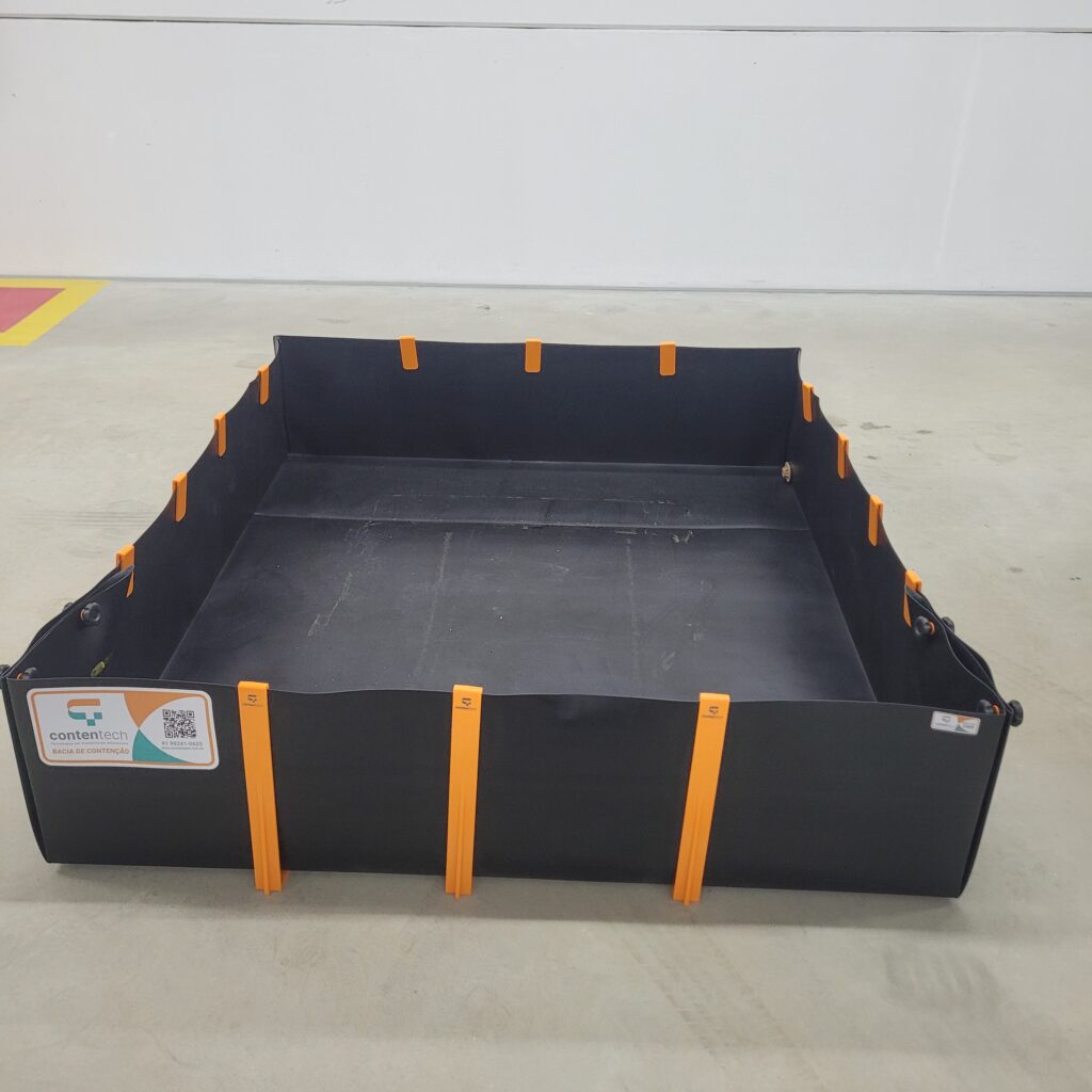 As bacias de contenção flexíveis são construídas em geomembrana de polietileno de alta densidade, com resinas de alto peso molecular, formulado para obter resistência a maioria dos agentes químicos e degradação por raios ultravioleta.